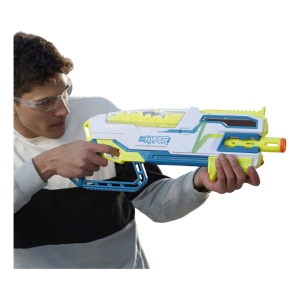 Pistola de acción de bomba Nerf Hyper Siege-50 y acción de fuego de golpe: bombea la diapositiva para cebar el lanzador y presiona el gatillo para lanzar 1 ronda, o dispara todas las rondas rápidamente con acción de disparo de golpe